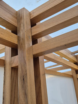 A estrutura, inteiramente pré-fabricada em madeira, foi desenvolvida em colaboração com a Timbau Estruturas e montada em sistema seco sobre base elevada. A lógica construtiva valoriza a precisão digital e a racionalização de peças, evidenciando conceitos de sustentabilidade, flexibilidade espacial e montagem colaborativa.