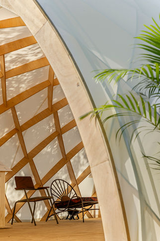 Desenvolvido nos programas Grasshopper e Rhino, o projeto foi executado com precisão CNC pela Forest, garantindo um aproveitamento de quase 100% das chapas de compensado naval e promovendo o uso consciente dos recursos naturais. A estrutura é composta por peças leves, com até 70 cm, o que facilitou o transporte, o manuseio e permitiu uma montagem em tempo recorde.